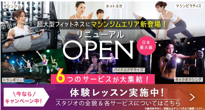 ホットヨガ(女性専用)やキックボクシング、ピラティスは予約制で、ホットヨガ(スクリーン)、トランポリン、バイク、マシーンは予約なく自由に利用できます。
