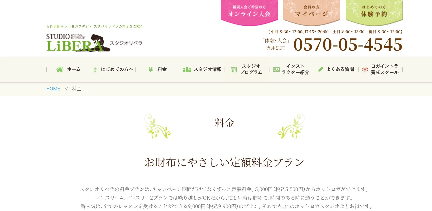 月謝制のホットヨガスタジオでは、月4回コースと通い放題コースが設定されているところが多く、目安として月4回で9,000〜10,000円前後、通い放題で10,000〜13,000円前後の価格帯が中心です。スタジオリベラでは、オール会員(月額9,900円・税込)やマンスリー4会員(月額7,700円・税込)など、東海地区最安値クラスの料金プランも用意されています。