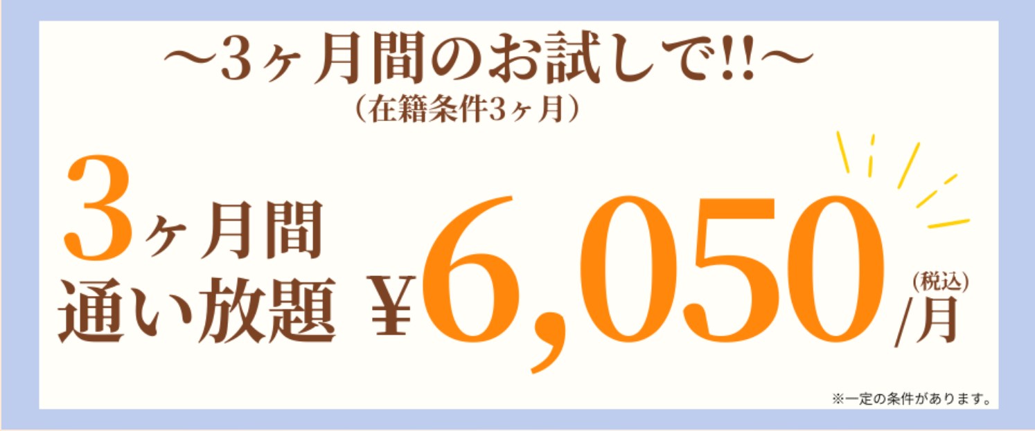 | 初期費用 | 入会金5,000円 登録金5,000円 施設利用料2,500円 ※キャンペーン適用あり |