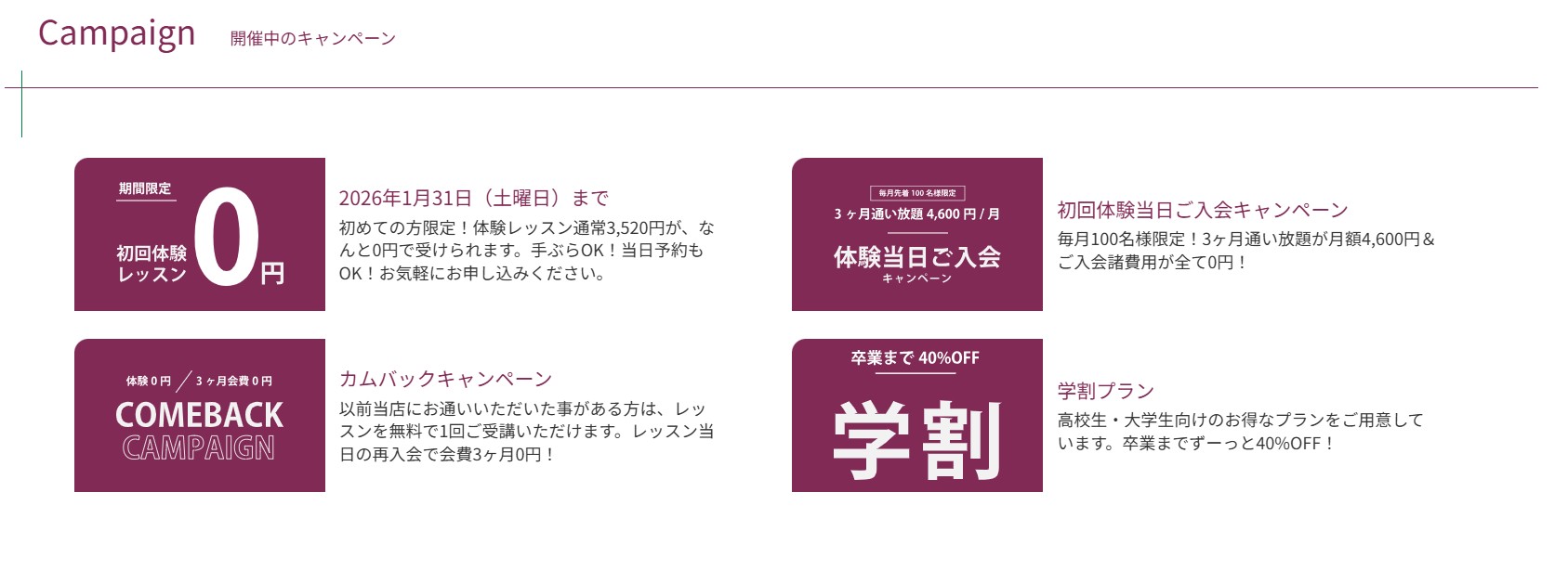 | 体験レッスン | 2,200円〜 |