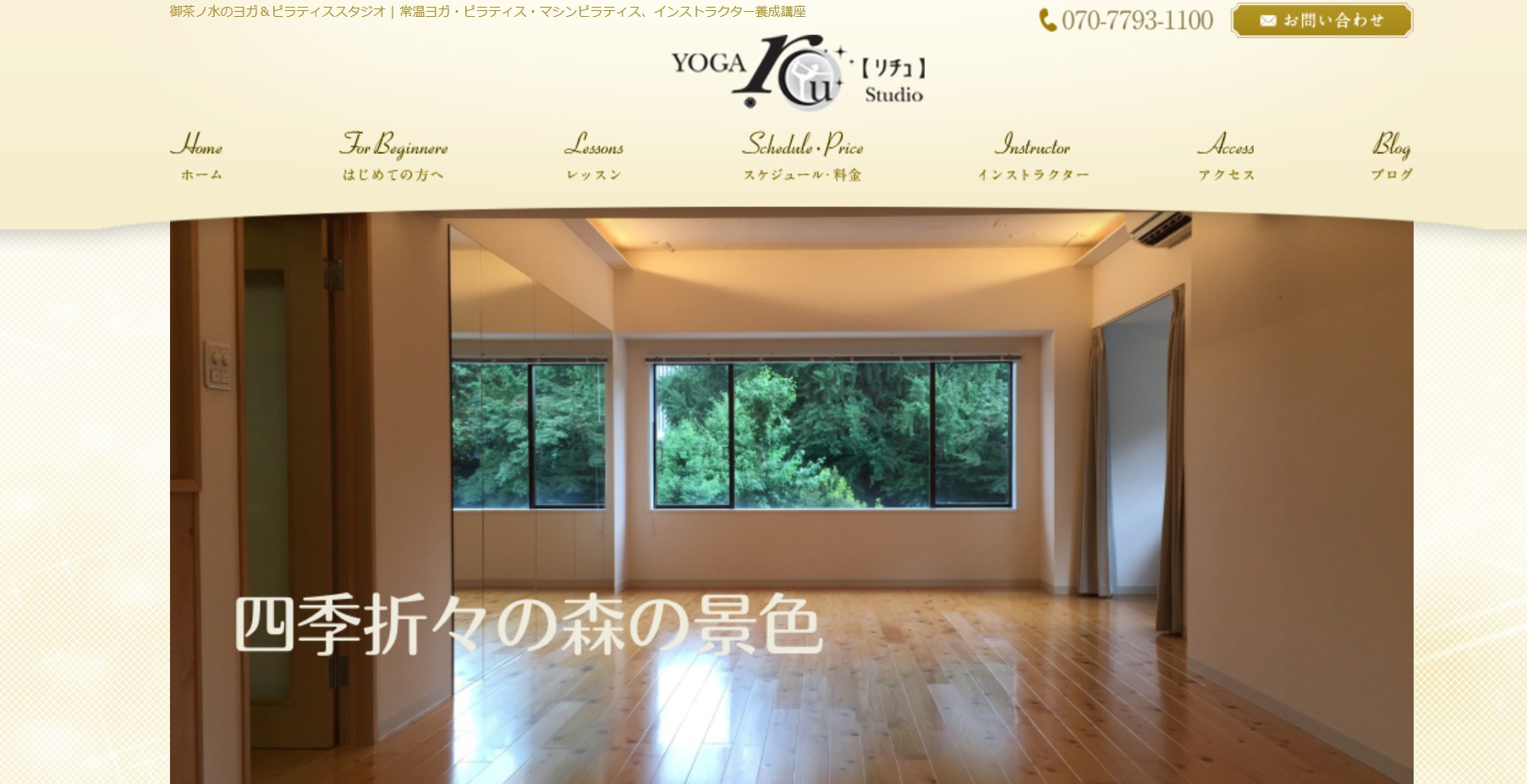 rcu【リチュ】御茶ノ水は、神田明神そばの緑豊かな景色と、国産ヒノキを使用した床が自慢の常温ヨガ・ピラティススタジオです。都会にありながら森の中にいるようなリラックスした空間でレッスンを受けられるのが魅力。少人数制を徹底しており、初心者でも一人ひとり丁寧なポーズ指導が受けられます。月額1万円以下の通い放題プランがあり、エリア内でも非常にリーズナブルな価格設定です。