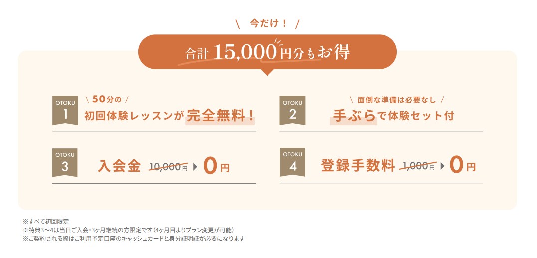 ※1すべて初回限定。当日ご入会・3ヶ月継続の方限定です(4ヶ月目よりプラン変更が可能)。