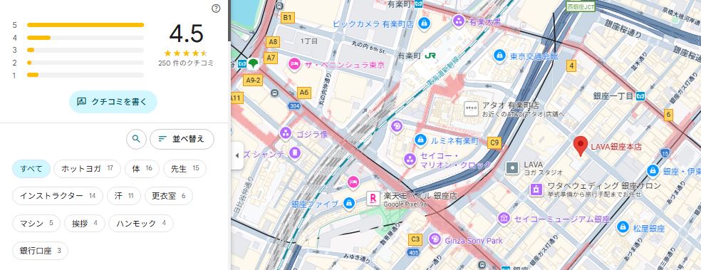 Google口コミを調べてみると4.5という高評価で、銀座という立地の良さと質の高いサービスが評判の店舗でした。