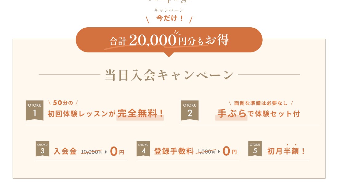 | 体験レッスン | 無料 | 無料 | 無料 | 無料 | 9,800円 (キャンペーン適用で無料) |