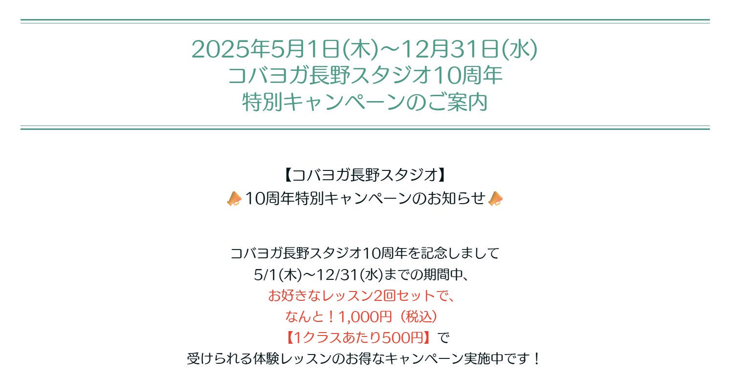 姿勢改善や体の使い方を見直したい方には、コバヨガ長野など常温ヨガ中心のスタジオもチェックしておきたいところです。コバヨガ長野では、さまざまな種類のスタジオレッスンが開催されており、通い放題プランを利用すると、月約50クラスの中から自分に合うレッスンを選びやすくなっています。継続的にレッスンを受けることで、日常生活でも姿勢を意識しながら過ごす習慣づくりにつなげやすいでしょう。