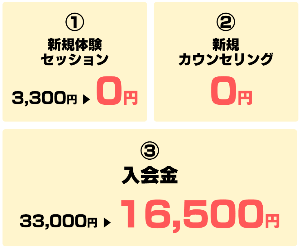 | 体験レッスン | 0円 | 0円(見学のみ) | 3,300円 | 2,200円 | 0円 |