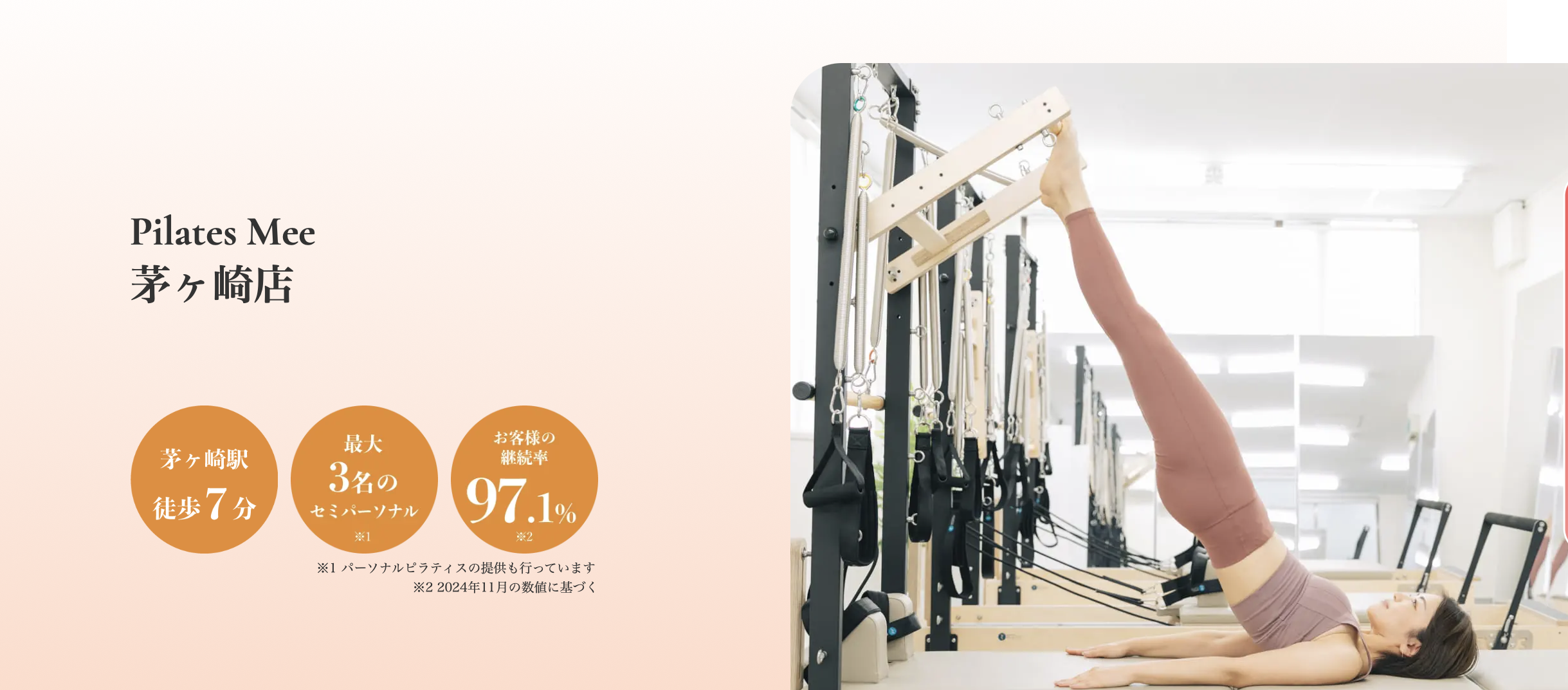 Pilates Mee 茅ヶ崎店は、マシンを使った少人数制のセミパーソナルスタジオです。