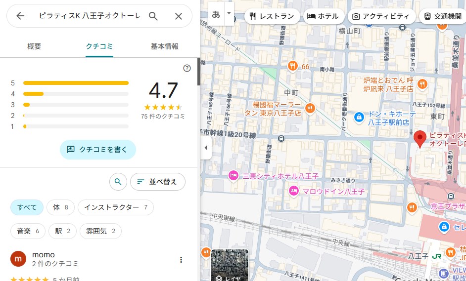 結論から言うと、ピラティスK八王子オクトーレ店は口コミ評価が非常に高く、初心者でも安心して通いやすいスタジオだと分かりました。