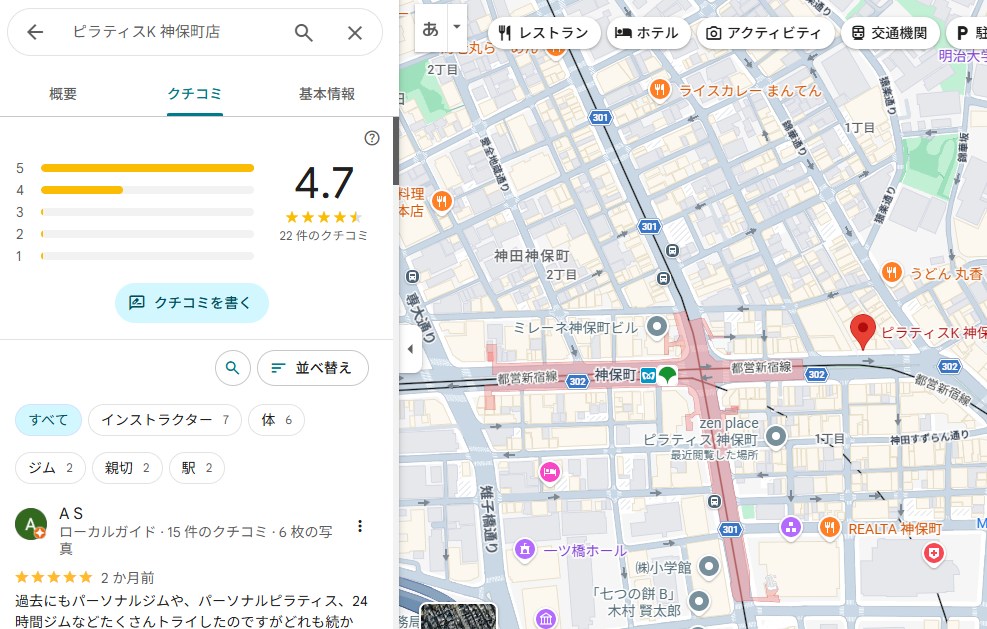 結論から言うと、ピラティスK神保町店は口コミ評価が非常に高く、初心者でも安心して通いやすいスタジオだと分かりました。