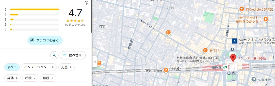 結論から言うと、Rintosull(リントスル)高円寺店は口コミ評価が非常に高く、初心者でも安心して通いやすいスタジオだと分かりました。