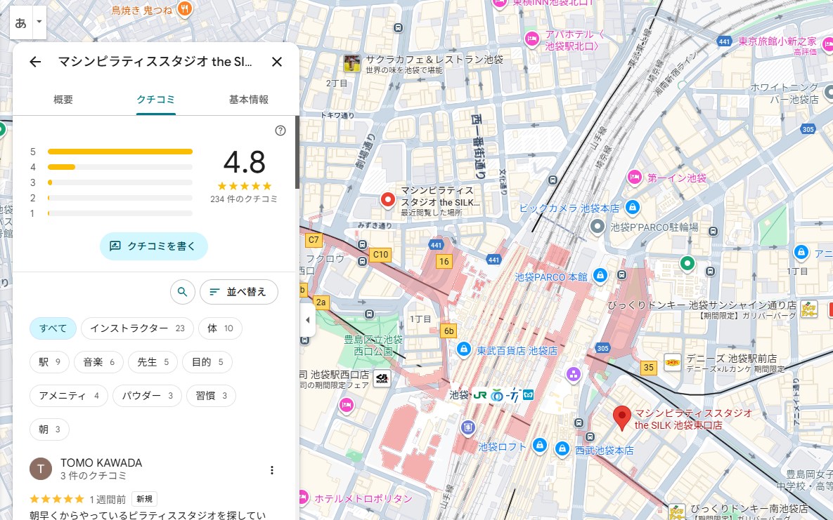 口コミを分析すると、the SILK池袋店は「初心者でも安心して通えるマシンピラティススタジオ」として高い満足度を得ています。