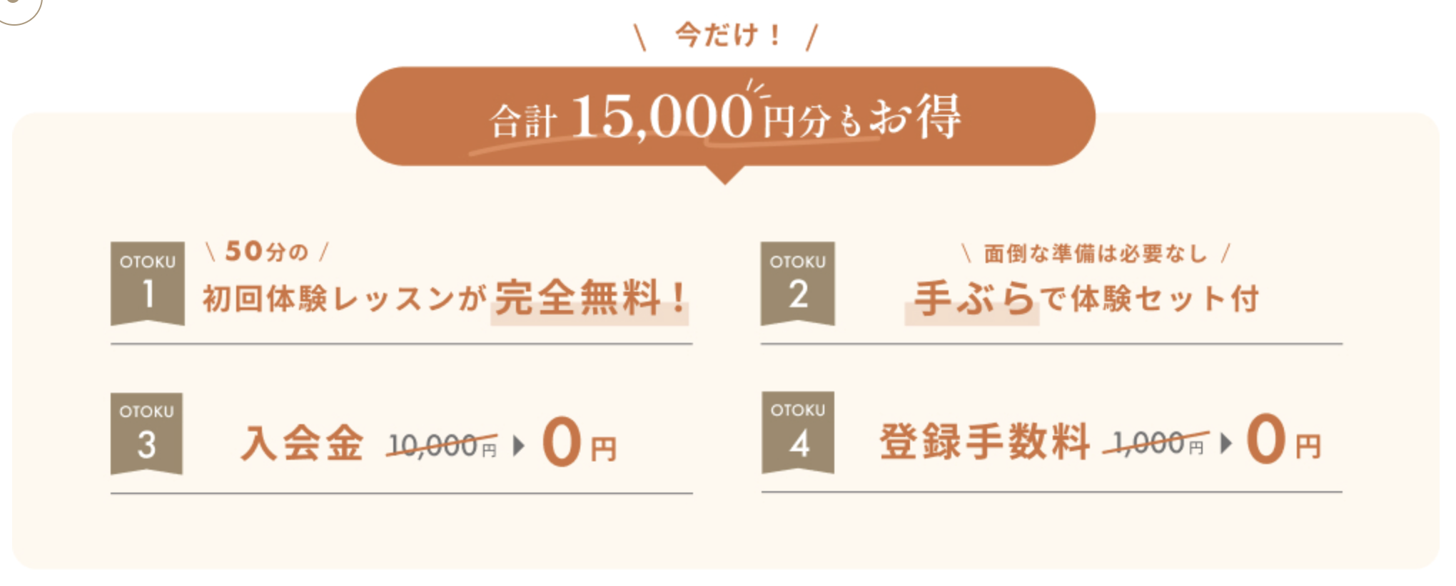 | 体験レッスン | 3,850円(キャンペーン適用で無料) |