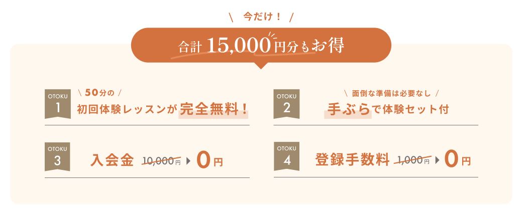| 体験レッスン | 9,800円(キャンペーン適用で無料) |