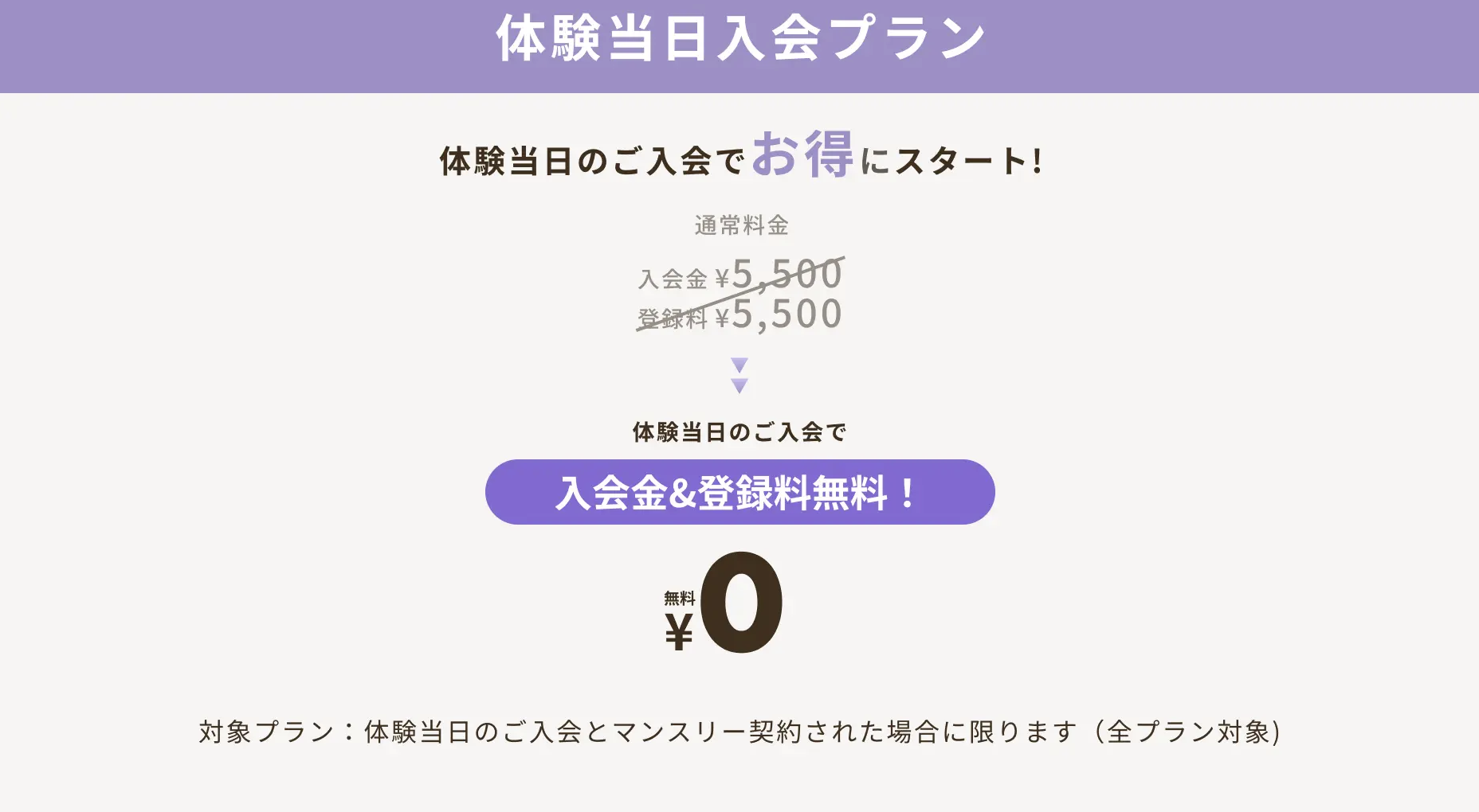 初期費用 | 5,500円(入会金)+5,500円(登録料)+2,530円(施設利用料) |