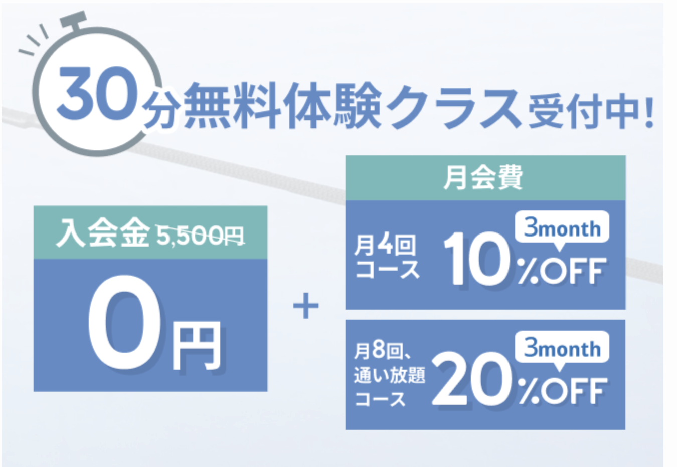 また、1回のレッスンはわずか30分の短期時間集中型で、仕事や家事・育児の合間に通いやすく忙しい人でも続けやすいのが特徴です。