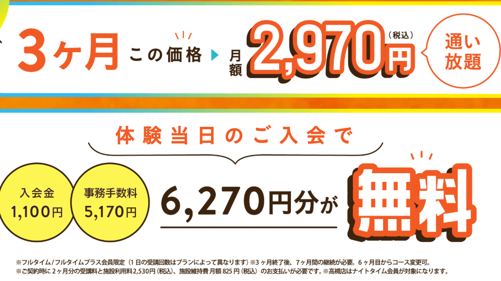 初期費用 | 体験当日入会で入会金&事務手数料が0円 入会金1,100円 事務手数料5,170円 施設利用料2,530円 2か月分受講料 施設維持費825円 |