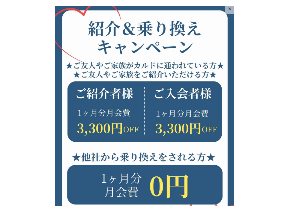 初回限定で500〜1,000円程度の体験料金が設定されている場合が多く、キャンペーン時には無料になることもあります。
