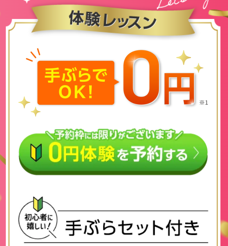 初回限定で500〜1,000円程度の体験料金が設定されている場合が多く、キャンペーン時には無料になることもあります。