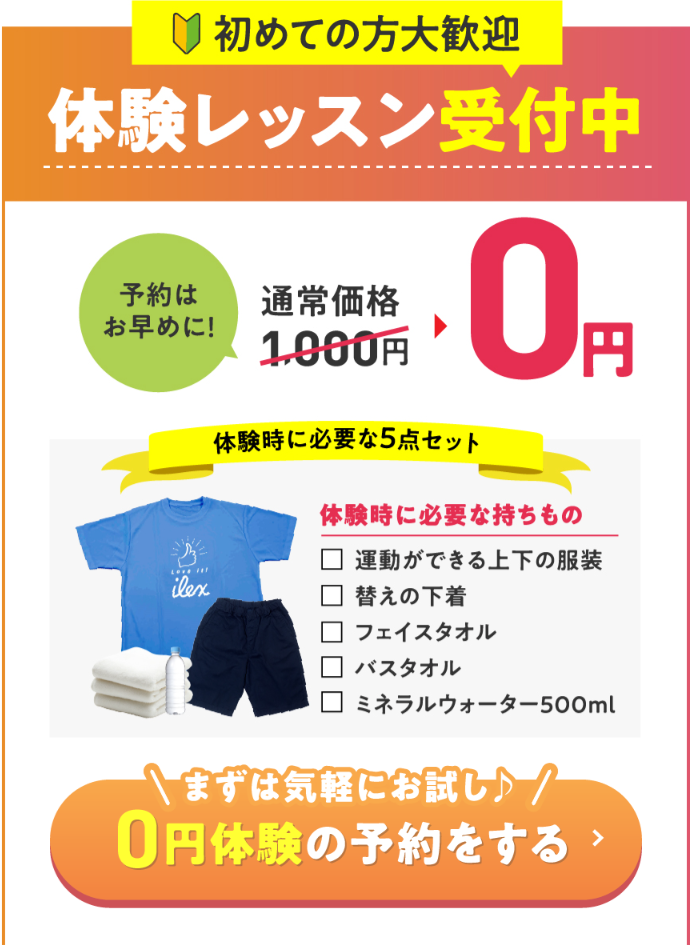 体験レッスンに必要な基本の持ち物は「動きやすいウェア・替えの下着・汗拭き用タオル・水分補給用のドリンク」です。