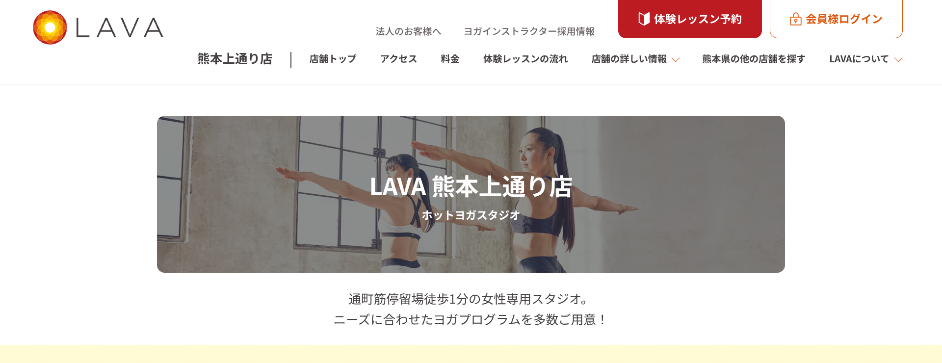 LAVA熊本上通り店は、通町筋電停から徒歩1分の女性専用ホットヨガスタジオで、アクセスのよさが魅力。