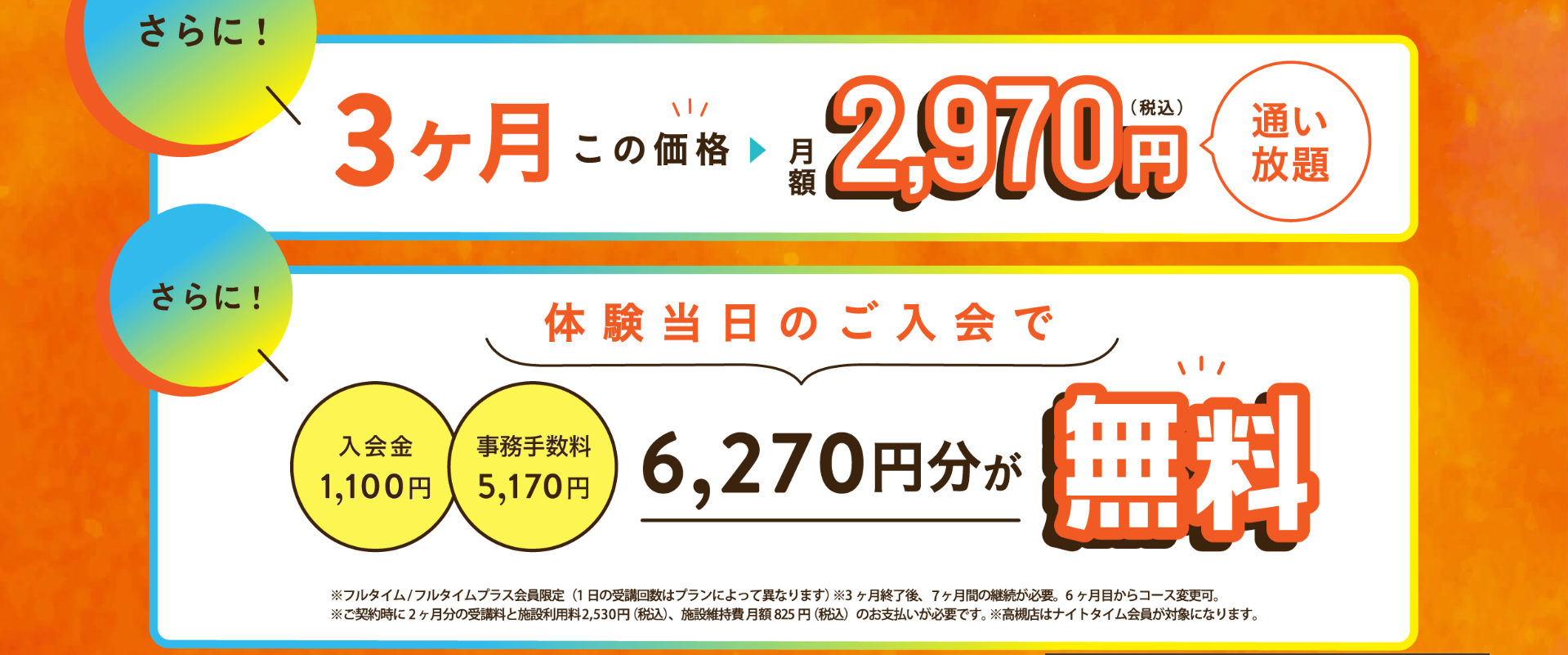 初期費用 | 入会金5,000円 マンスリーメンバー登録費5,000円 施設利用料2,500円 ※キャンペーン適用あり |